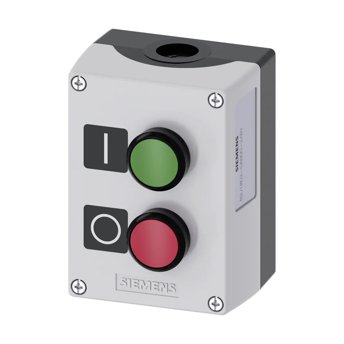 3SU1802-0AB00-2AB1 to gotowa do użycia, 2-przyciskowa obudowa sterownicza SIRIUS ACT dla elementów 22 mm, z przyciskami czerwony O (1NC) i zielony I (1NO) oraz przyłączem śrubowym. Dzięki wysokiej klasie szczelności IP66/IP67/IP69K, przepustom M20 (góra/dół) i montażowi do podłoża sprawdza się jako kompaktowa stacja sterowania w aplikacjach wymagających podwyższonej ochrony obudowy.