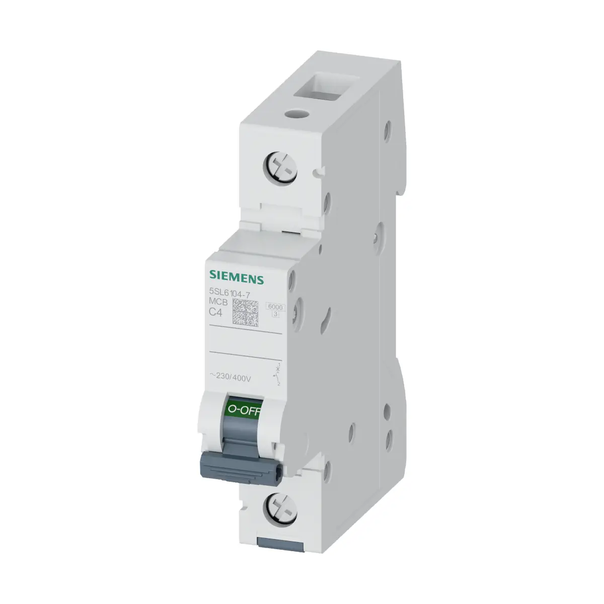 5SL6104-7 to wyłącznik nadmiarowo-prądowy Siemens z rodziny SENTRON, przeznaczony do zabezpieczania obwodów przed skutkami przeciążeń i zwarć. Jest to wykonanie 1-biegunowe (1 moduł) o charakterystyce wyzwalania C, prądzie znamionowym 4 A oraz zdolności łączeniowej 6 kA dla instalacji 230/400 V.