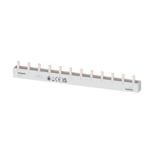 Siemens 5ST3738 (SENTRON) to 3‑fazowa szyna zbiorcza kołkowa o przekroju 10 mm², zabezpieczona przed dotknięciem i przeznaczona do zasilania wyłączników nadmiarowo‑prądowych 3P. Szyna ma długość 214 mm, jest z możliwością cięcia i dostarczana z nasadkami krańcowymi, co ułatwia dopasowanie do konkretnej konfiguracji rozdzielnicy.
