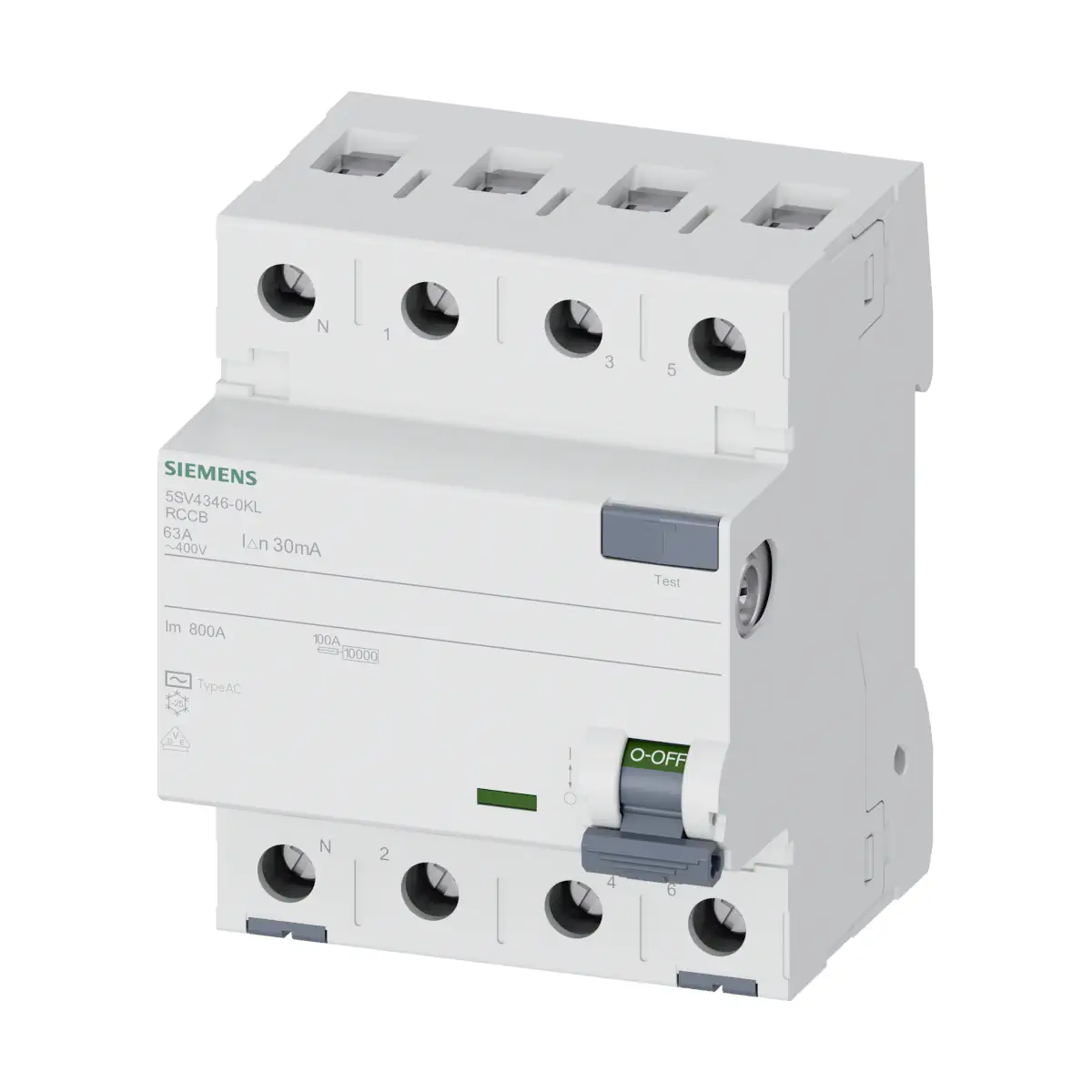 Siemens 5SV4346-0KL to wyłącznik ochronny różnicowy (RCD) SENTRON, 4-biegunowy, typ AC, o prądzie znamionowym In 63 A i czułości IΔn 30 mA, przeznaczony do pracy w sieciach AC 400 V / 50 Hz. Wersja N z lewej strony ułatwia dopasowanie aparatu do układu rozdzielnicy i prowadzenia przewodów. Wykonanie bezzwłoczne oznacza działanie bez zwłoki czasowej.