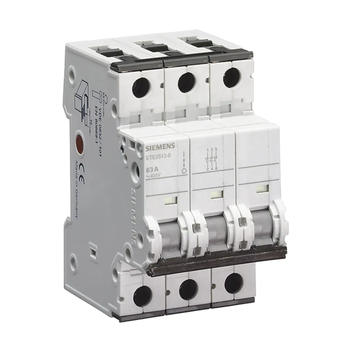 Siemens 5TE2513-0 (SENTRON) to przełącznik wł./wył. przeznaczony do pracy w obwodach 400 V, w wykonaniu 3-biegowym, o znamionowym prądzie roboczym 63 A. Urządzenie jest 3-biegunowe, wyposażone w dźwignię wychylną i przeznaczone do montażu na stałe na szynie montażowej w rozdzielnicach.