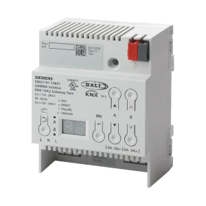 Siemens KNX/DALI Gateway Twin N 141/31 (5WG1141-1AB31) to bramka integrująca system KNX (TP1-256) z magistralą DALI, wyposażona w dwa niezależne interfejsy DALI (kanał A i B). Umożliwia sterowanie oświetleniem DALI (np. statecznikami/sterownikami z interfejsem DALI) oraz dwukierunkową komunikację zgodnie z IEC 62386 – wraz z odczytem informacji statusowych i komunikatów błędów z linii DALI. Urządzenie posiada zintegrowany zasilacz dla elektroniki oraz generuje napięcie magistrali DALI, dzięki czemu nie wymaga (ani nie dopuszcza) zewnętrznego zasilacza DALI.