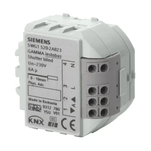 Siemens RS 520/23 (5WG1 520-2AB23) to aktor roletowy/żaluzjowy KNX z jednym wyjściem przekaźnikowym (podwójny kanał) do sterowania napędem 230 V AC. Elektronika jest zasilana z magistrali KNX, a wyjście przełącza obciążenie do 6 A. Wbudowana detekcja pozycji krańcowych wspiera pracę silnika z wyłącznikami krańcowymi lub elektroniką odłączającą. Obsługuje jeden silnik na kanał i łączy się z KNX przez listwę zaciskową.
