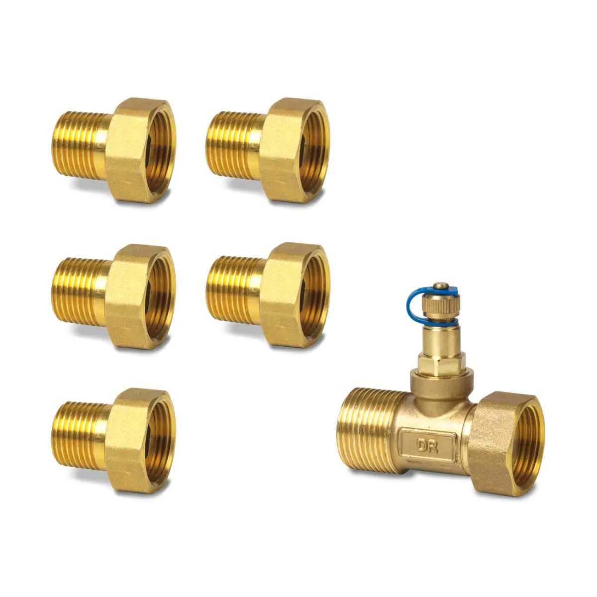 ALN14.155B-ALP55 Zestaw śrubunków gwintowanych (5 szt.), przyłącze zaworu G3/4, przyłącze instalacji R1/2, mosiądz, z króćcem pomiaru ciśnienia (1szt.)