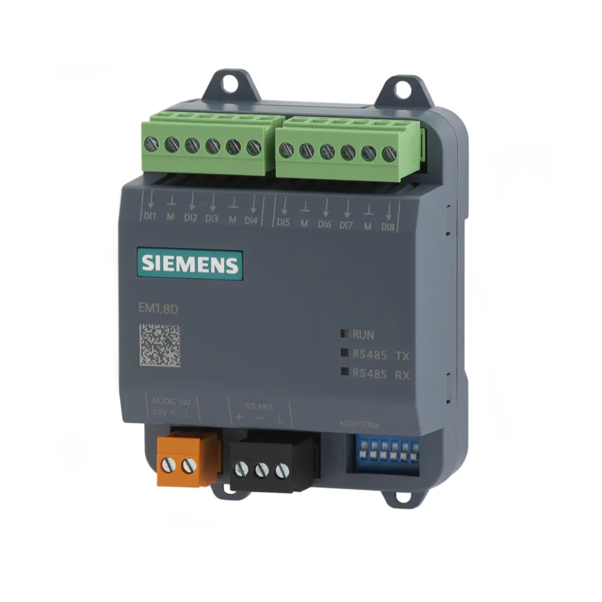 Siemens EM1.8D (S55370-C203) to kompaktowy moduł rozszerzeń I/O z serii Desigo Essentials do systemów Modbus RS485. Udostępnia 8 wejść cyfrowych do odczytu stanów styków (bez obsługi wejść impulsowych) i może współpracować z dowolnym sterownikiem Modbus. Zasilanie AC/DC 24 V, adresowanie przełącznikiem DIP oraz włączana terminacja EOL ułatwiają uruchomienie, a diody RUN/TX/RX wspierają diagnostykę. Wyjmowane listwy śrubowe i kody QR przyspieszają instalację i serwis, a montaż jest możliwy na szynie DIN lub śrubowo.