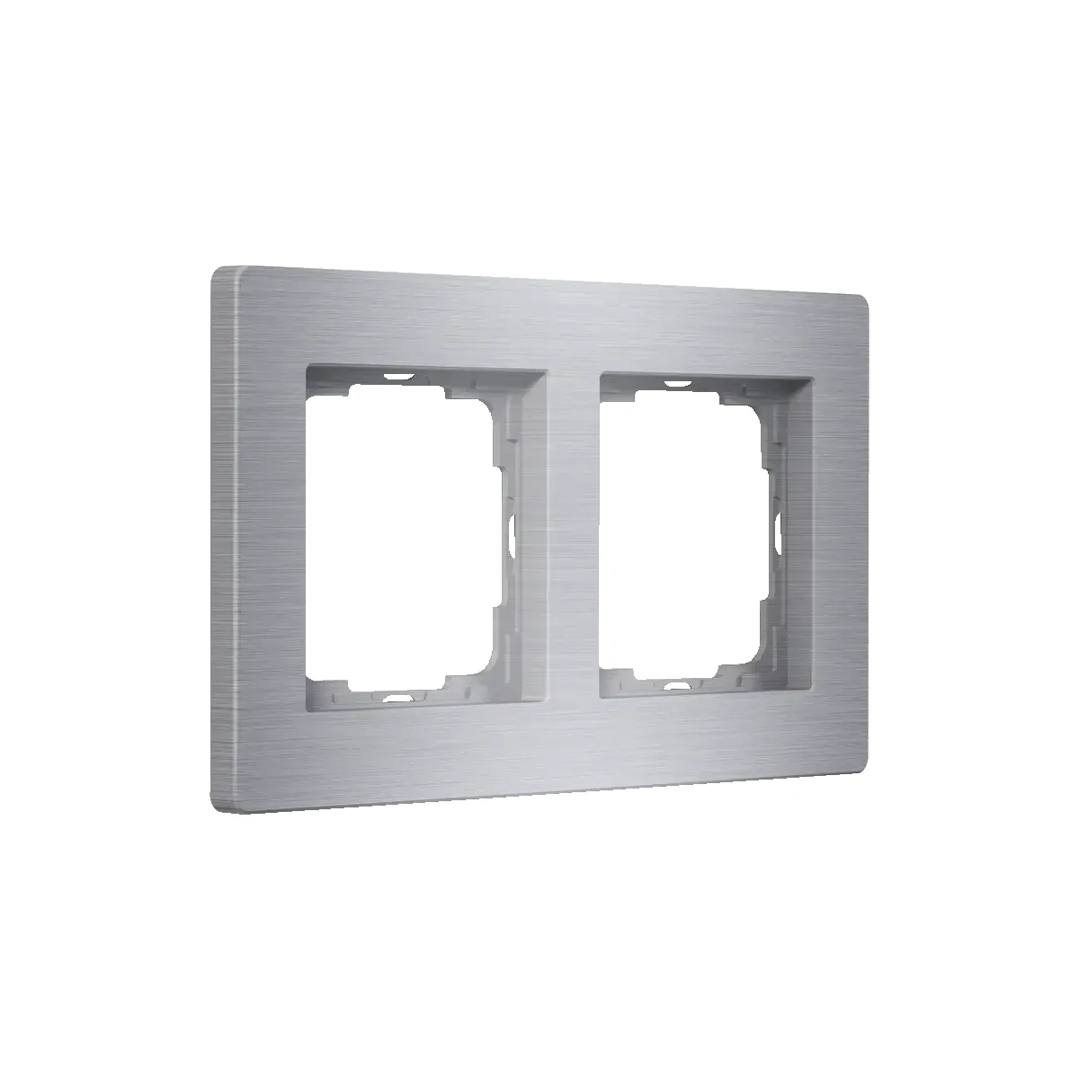 Ramka Enertex® AluRa Double ALU służy do estetycznego wykończenia montażu dwóch wkładów 55 mm w jednej ramce. Sprawdzi się wszędzie tam, gdzie wymagany jest spójny, nowoczesny wygląd osprzętu – szczególnie w zestawieniach z mechanizmami Jung Serie A i Jung AS.