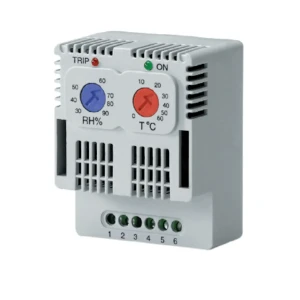 ETUH22 służy do kontroli warunków w obudowach (np. szafach sterowniczych) i sterowania elementami wykonawczymi w zależności od wilgotności oraz temperatury. Zmiana stanu styku następuje w zależności od ustawień – przy wysokiej wilgotności lub niskiej temperaturze.