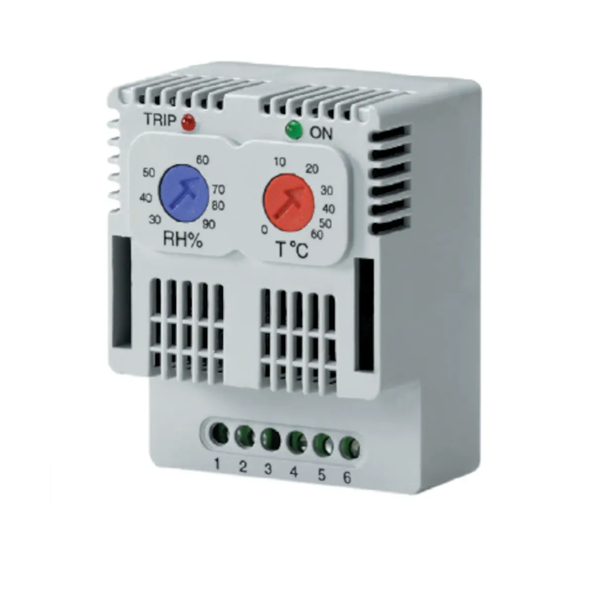 ETUH22 to kompaktowy termo-higrostat na szynę DIN z zasilaniem 230 V AC, przeznaczony do sterowania urządzeniami w obudowach (typowo grzałkami) na podstawie wilgotności (20…90% RH) i temperatury (0…+60°C). Przełączny styk, regulowane progi z histerezą oraz sygnalizacja LED sprawiają, że jest to praktyczne rozwiązanie do utrzymania właściwych warunków wewnątrz szaf i obudów.