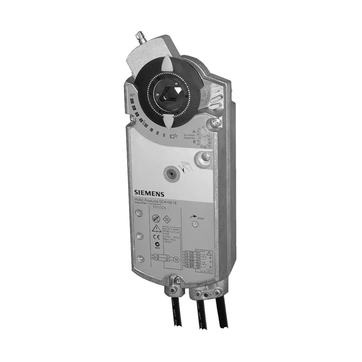 Siemens GCA326.1E to obrotowy siłownik do przepustnic powietrza z serii OpenAir™, wyposażony w sprężynę powrotną (funkcja bezpieczeństwa – powrót do położenia „zerowego” przy zaniku zasilania). Przeznaczony jest do sterowania 2-stawnego i zasilania z sieci AC 230 V, oferując moment obrotowy 18 Nm oraz samocentrujący adapter osi. Zakres roboczy można ustawiać mechanicznie w przedziale 0…90°, a siłownik dostarczany jest z fabrycznie zamontowanym przewodem o długości 0,9 m.