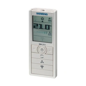 IRA211 to pilot sterowania zdalnego na podczerwień firmy Siemens, przeznaczony do współpracy z pomieszczeniowymi regulatorami temperatury wyposażonymi w odbiornik IR. Umożliwia wygodny wybór trybu pracy (Komfort, Auto, Czuwanie), korektę wartości zadanej temperatury oraz sterowanie pracą wentylatora, a czytelny wyświetlacz pokazuje aktualne nastawy w pomieszczeniu w °C lub °F.