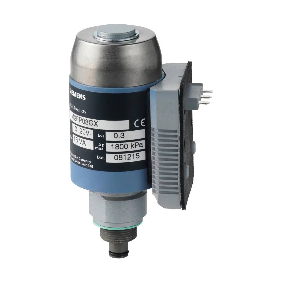 Siemens M2FP03GX to modulacyjny zawór pilotowy ACVATIX™ o PN 32, przeznaczony do precyzyjnego sterowania zaworami głównymi 2–5” w układach chłodniczych, m.in. w chillerach. Siłownik magnetyczny zapewnia bardzo szybkie pozycjonowanie (ok. 1 s) i wysoką rozdzielczość, a pływający rdzeń gwarantuje hermetyczną pracę bez dławnicy i tarcia. Zawór ma kvs 0,3 m³/h, pracuje w zakresie -40…100°C i jest przeznaczony do czynników chłodniczych oraz R717. Do podłączenia elektrycznego wymaga obudowy ZM.. (osobno) i zasilania AC 24 V.