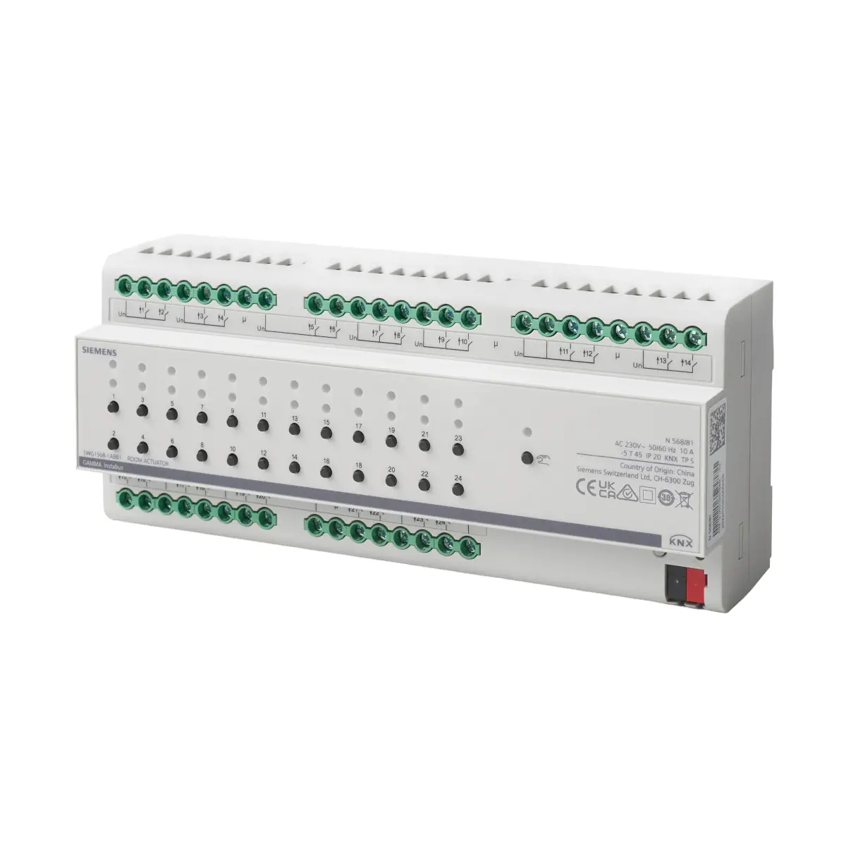 Siemens N 568/81 to zaawansowany 24-kanałowy aktor pokojowy KNX, przeznaczony do kompleksowego sterowania oświetleniem, napędami żaluzji AC/DC, wentylatorami oraz siłownikami zaworów grzewczych i chłodzących. Urządzenie montowane jest na szynie DIN 35 mm i zasilane bezpośrednio z magistrali KNX (DC 21…30 V) bez konieczności stosowania dodatkowego zasilacza.