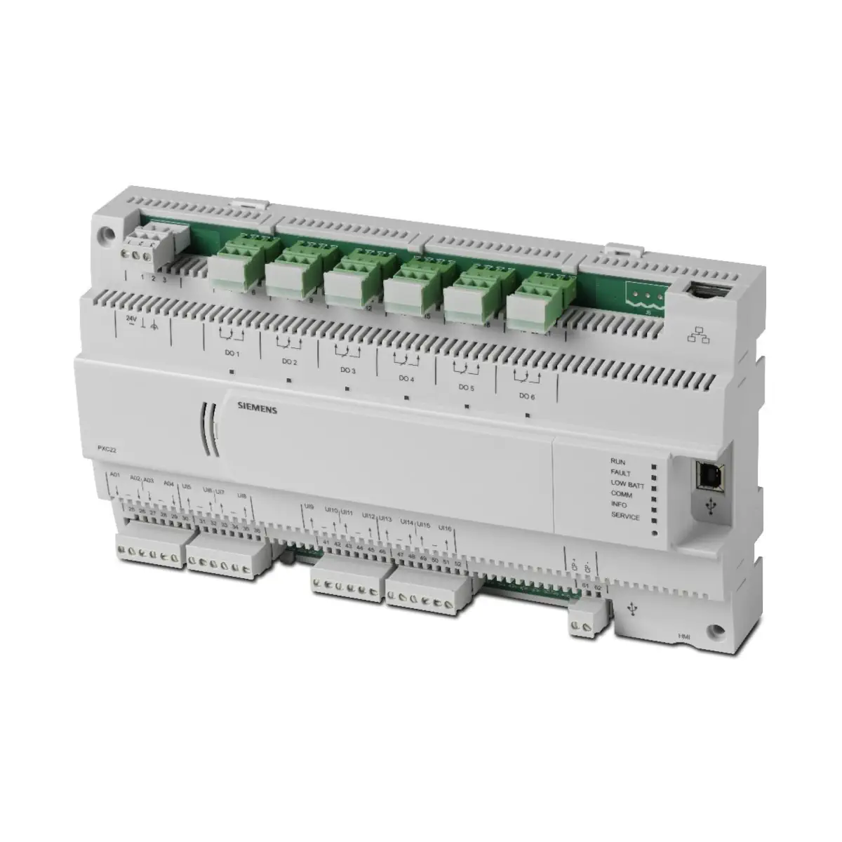 Siemens PXC22-E.D to kompaktowy, swobodnie programowalny sterownik automatyki z linii Desigo™ PX, przeznaczony do instalacji HVAC oraz zadań automatyki budynkowej. Wersja -E.D komunikuje się poprzez BACnet / IP (Ethernet 10/100 Base‑TX) i oferuje 22 fizyczne punkty I/O na płycie sterownika, łącząc uniwersalne wejścia/wyjścia oraz wyjścia przekaźnikowe w jednym urządzeniu. Karta katalogowa dotyczy firmware Desigo V6.1 lub nowszego.
