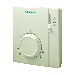 Siemens RAB21 to 2-stawny termostat pomieszczeniowy do 2-rurowych klimakonwektorów wentylatorowych, przeznaczony do instalacji ogrzewania lub chłodzenia. Umożliwia utrzymanie wymaganej temperatury w pomieszczeniu w zakresie 8…30 °C, oferuje ręczny przełącznik prędkości wentylatora 3-biegowego oraz funkcję przełączania ogrzewanie/chłodzenie za pomocą zewnętrznego termostatu przełączającego. Termostat realizuje regulację 2-stawną (ON/OFF) zaworu, przy napięciu przełączania 24…250 V AC, a element pomiarowy stanowi membrana wypełniona gazem.