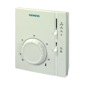 Siemens RAB31 to elektromechaniczny termostat pomieszczeniowy do 4‑rurowych klimakonwektorów. Zapewnia 2‑stawną regulację temperatury, ręczne przełączanie ogrzewanie/chłodzenie oraz sterowanie wentylatorem 3‑biegowym (praca ciągła na wybranym biegu lub automatyczna). Pracuje z napięciem przełączanym 24…250 V AC i sprawdza się w prostych, niezawodnych układach HVAC.