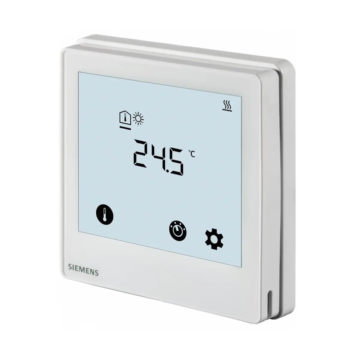 Siemens RDD810 to podtynkowy, dotykowy termostat pokojowy do instalacji grzewczych, zasilany AC 230 V. Duży, podświetlany ekran ułatwia zmianę nastawy i wybór trybów Comfort, Economy oraz Protection. Termostat steruje ogrzewaniem 2‑położeniowo ON/OFF przez bezpotencjałowe wyjście przekaźnikowe SPDT, współpracując m.in. z siłownikami zaworów i podłogówką. Dwa wejścia X1/X2 pozwalają podłączyć styk okienny, czujnik temperatury lub detekcję obecności.