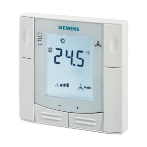 RDF600KN to podtynkowy pomieszczeniowy regulator temperatury Siemens z komunikacją KNX (tryb S-mode i LTE), przeznaczony do regulacji ogrzewania i/lub chłodzenia w strefach HVAC. Urządzenie obsługuje instalacje z klimakonwektorami 2-rurowymi, 2-rurowymi z nagrzewnicą elektryczną oraz 4-rurowymi, a także sterowanie sprężarką 1‑stopniową w układach DX. Regulator ma podświetlany wyświetlacz, oferuje regulację 2P / PI / P oraz zapewnia elastyczną konfigurację wejść/wyjść i trybów pracy z poziomu KNX, narzędzi uruchomieniowych lub lokalnego interfejsu HMI.