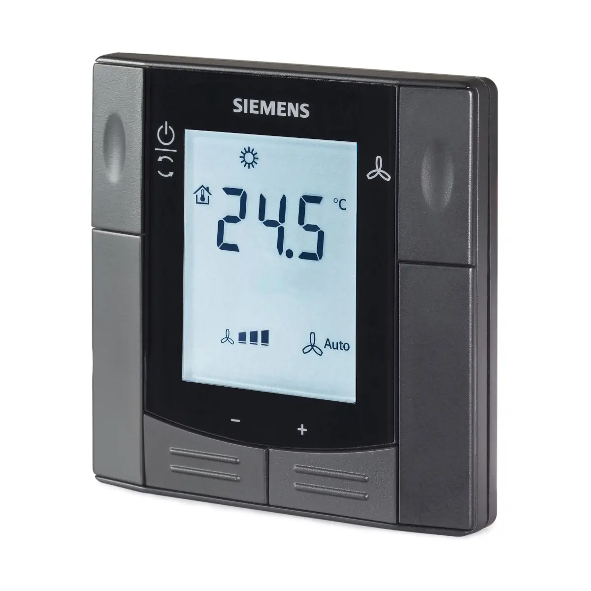Siemens RDF600KN/VB to podtynkowy regulator temperatury do pomieszczeń z komunikacją KNX (S‑mode i LTE), zasilany 230 V AC. Umożliwia regulację ogrzewania i/lub chłodzenia m.in. klimakonwektorów 2‑ i 4‑rurowych oraz urządzeń DX ze sprężarką 1‑stopniową. Oferuje regulację 2P/PI/P, wyjścia 2‑ lub 3‑stawne, sterowanie wentylatorem 1 lub 3 biegów oraz 2 wejścia wielofunkcyjne. Wersja /VB ma czarny front RAL 9004 i podświetlany wyświetlacz.