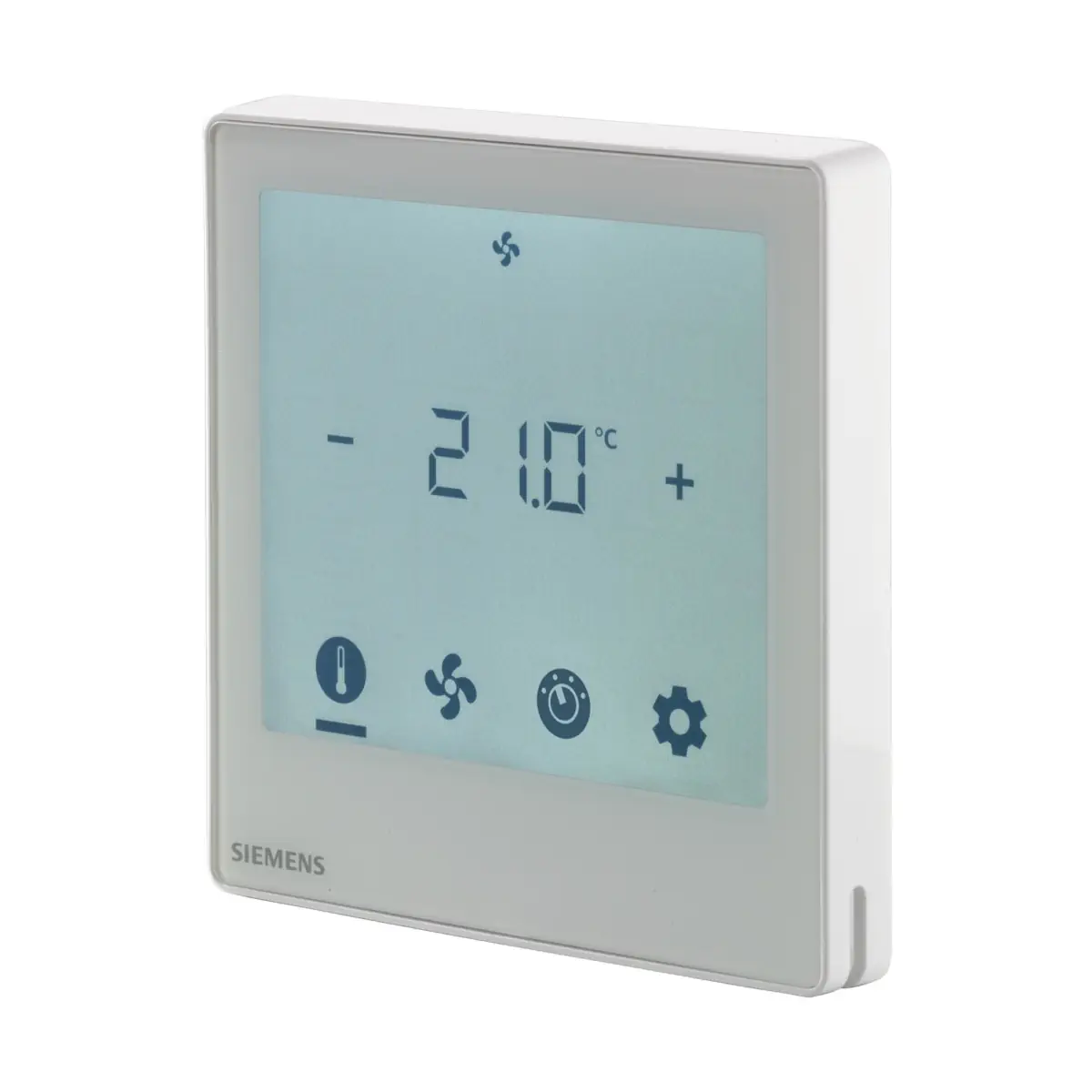 RDF800KN to nowoczesny pomieszczeniowy regulator temperatury Siemens z komunikacją KNX (tryb S-mode i LTE) oraz dużym, podświetlanym ekranem dotykowym. Regulator przeznaczony jest do regulacji ogrzewania i/lub chłodzenia w pomieszczeniach i strefach, m.in. dla klimakonwektorów 2-rurowych, 2-rurowych z nagrzewnicą elektryczną oraz 4-rurowych, instalacji uniwersalnych, a także do sterowania sprężarkami 1-stopniowymi w układach DX (również z nagrzewnicą elektryczną).