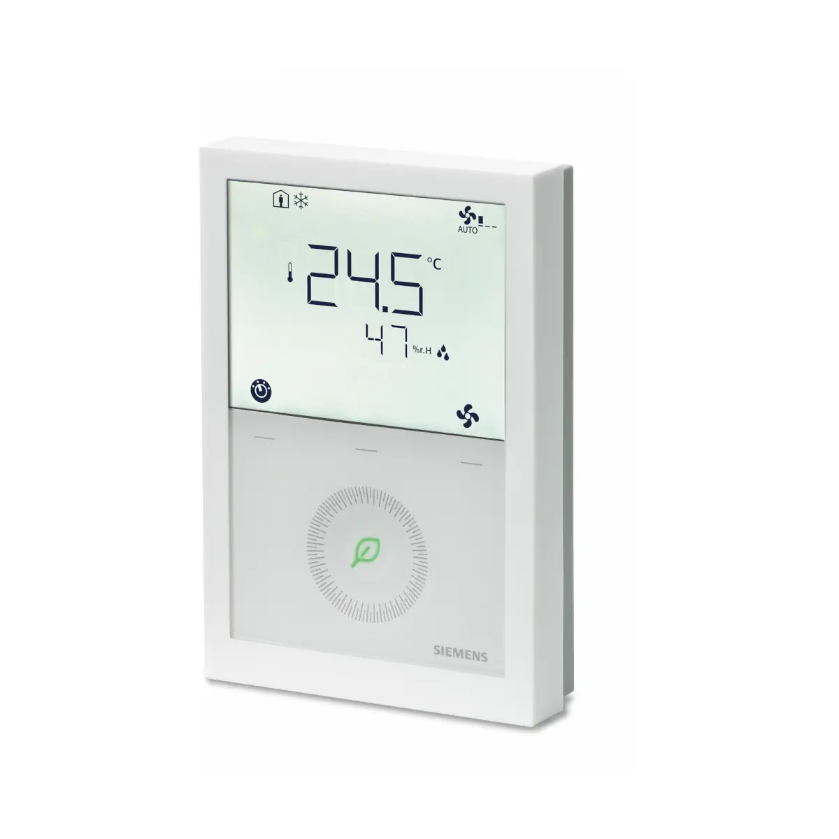 Siemens RDG264KN to zaawansowany regulator pomieszczeniowy KNX z wbudowanymi czujnikami temperatury, wilgotności oraz CO2, przeznaczony do sterowania klimakonwektorami i aplikacjami DX. Oferuje sterowanie wentylatorem 3-biegowym lub DC 0...10 V oraz wyjścia analogowe DC 0...10 V (SELV) do sterowania elementami wykonawczymi, a także wygodne uruchomienie z poziomu HMI, ETS/Synco ACS i aplikacji Siemens PCT Go.