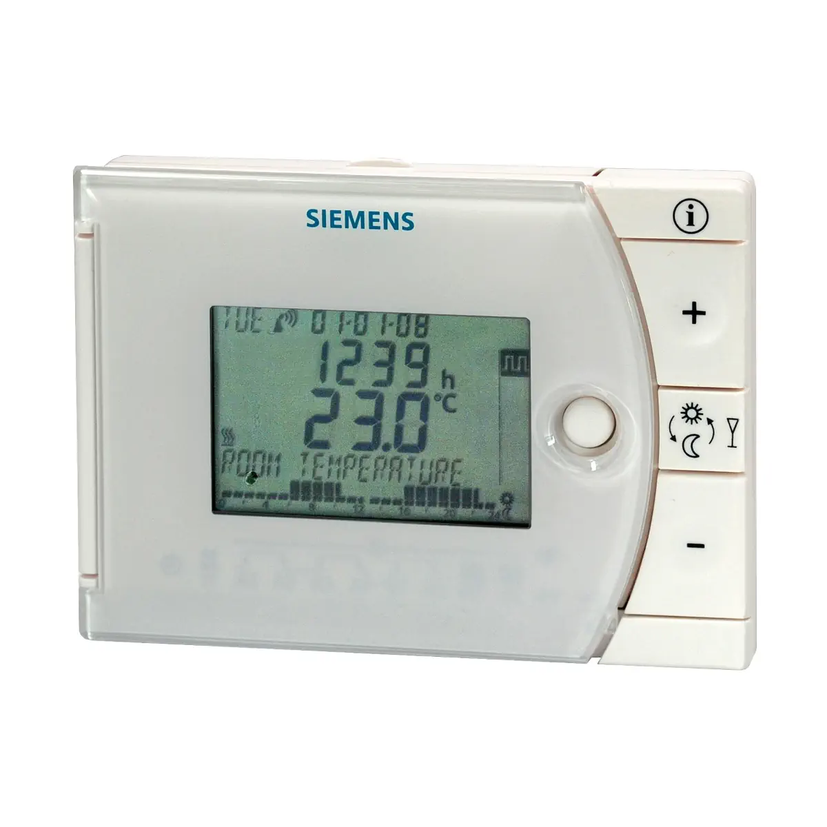 Siemens REV13 to zaawansowany, a jednocześnie prosty w obsłudze pomieszczeniowy regulator temperatury z programem dobowym. Zasilanie bateryjne, duży podświetlany wyświetlacz, elastyczne tryby pracy (automatyczne i ciągłe), adaptacyjna regulacja PID lub klasyczna regulacja 2-stawna, możliwość sterowania zdalnego T1/T2 oraz rozbudowane opcje konfiguracyjne (przełączniki DIP, poziom instalatora) sprawiają, że jest to uniwersalne rozwiązanie do precyzyjnej regulacji stref grzewczych w budynkach mieszkalnych i komercyjnych.