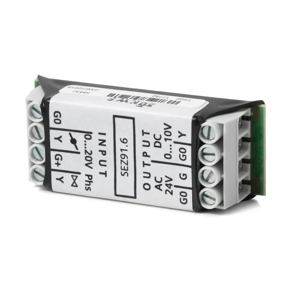 SEZ91.6 to kompaktowy interfejs (konwerter sygnału) firmy Siemens, przeznaczony do współpracy pomiędzy regulatorem z sygnałem wyjściowym 0...20 V DC Phs (z odcięciem fazy) a urządzeniami sterowanymi standardowym sygnałem 0...10 V DC. Interfejs jest zasilany napięciem 24 V AC (SELV) i udostępnia dwa oddzielne zakresy robocze – osobno dla siłowników zaworów magnetycznych oraz siłowników OpenAir do przepustnic powietrza, co ułatwia integrację bez konieczności zmiany parametrów w regulatorze.