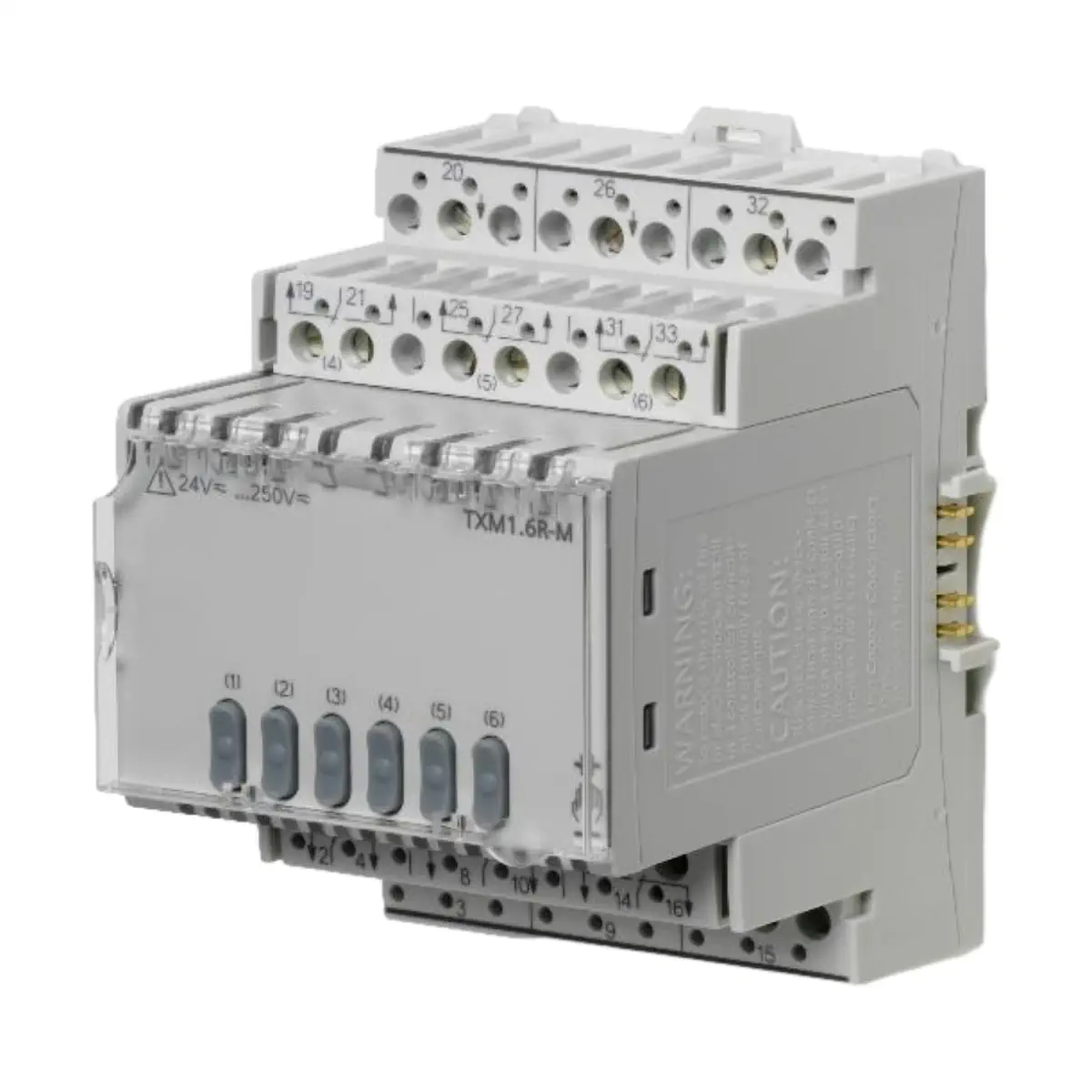 Siemens TXM1.6R-M to moduł przekaźnikowy systemu TX‑I/O™ w obudowie DIN, przeznaczony do realizacji wyjść przełączających w automatyce budynkowej. Oferuje 6 bezpotencjałowych wyjść przekaźnikowych (styki przełączające) z trójkolorową sygnalizacją LED stanu (czerwona/żółta/zielona) oraz przyciskami lokalnego sterowania zgodnymi z ISO 16484-2, co ułatwia uruchomienie i diagnostykę bezpośrednio na obiekcie.