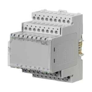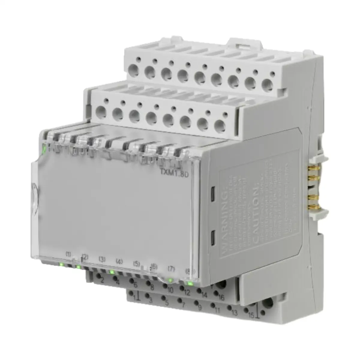 TXM1.8D to moduł 8 wejść dwustanowych z rodziny Siemens TX‑I/O™, przeznaczony do bezpośredniego podłączania urządzeń peryferyjnych w instalacjach automatyki budynkowej. Każde wejście może być indywidualnie skonfigurowane jako wejście dwustanowe, impulsowe (z funkcją pamięci) lub zliczające (do 10 Hz). Stany wejść są sygnalizowane trójkolorowymi diodami LED (zielona, żółta lub czerwona), co ułatwia diagnostykę oraz serwis.