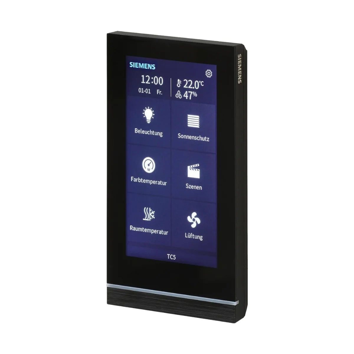 UP 205/21 (5WG1205-2AB21) to wielofunkcyjny wyświetlacz i zadajnik pomieszczeniowy z komunikacją KNX S-Mode z serii GAMMA instabus. Urządzenie wyposażono w 5-calowy, kolorowy, pojemnościowy ekran dotykowy (480 × 854), który umożliwia wygodną wizualizację i sterowanie funkcjami automatyki budynkowej: oświetleniem, zacienianiem, scenami oraz HVAC (w tym regulator PI temperatury i/lub wentylacji oraz interfejs VRF/VRV przez dedykowaną bramkę). TC5 wymaga podłączenia magistrali KNX oraz zewnętrznego zasilania pomocniczego DC 24…30 V.
